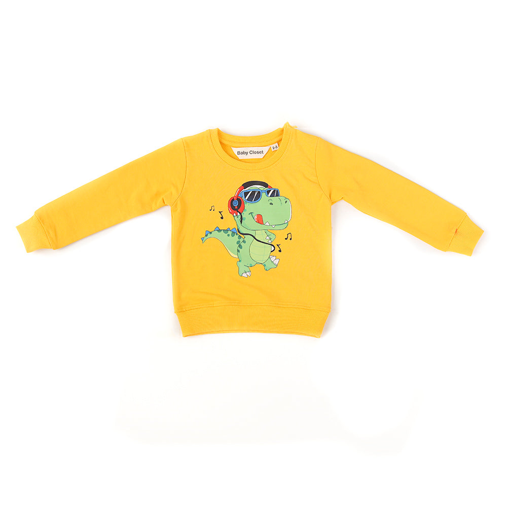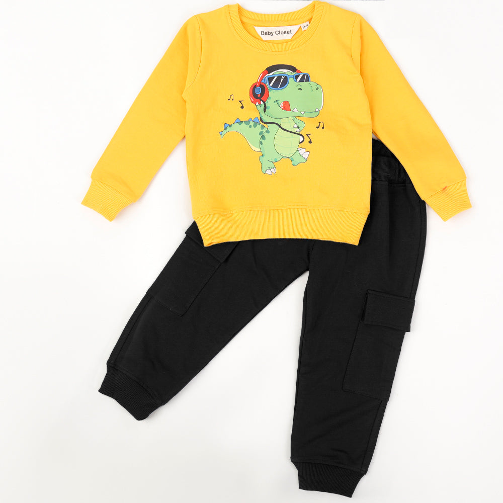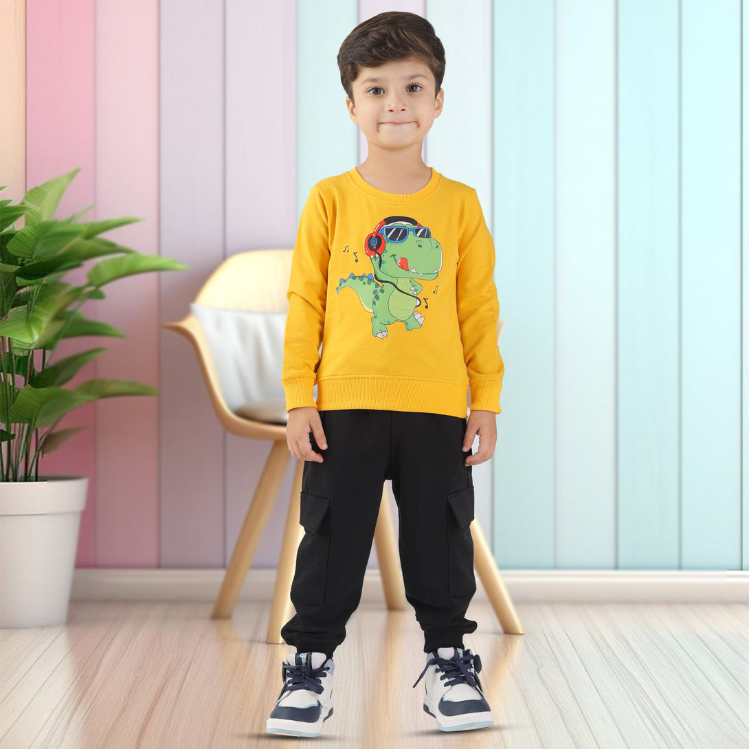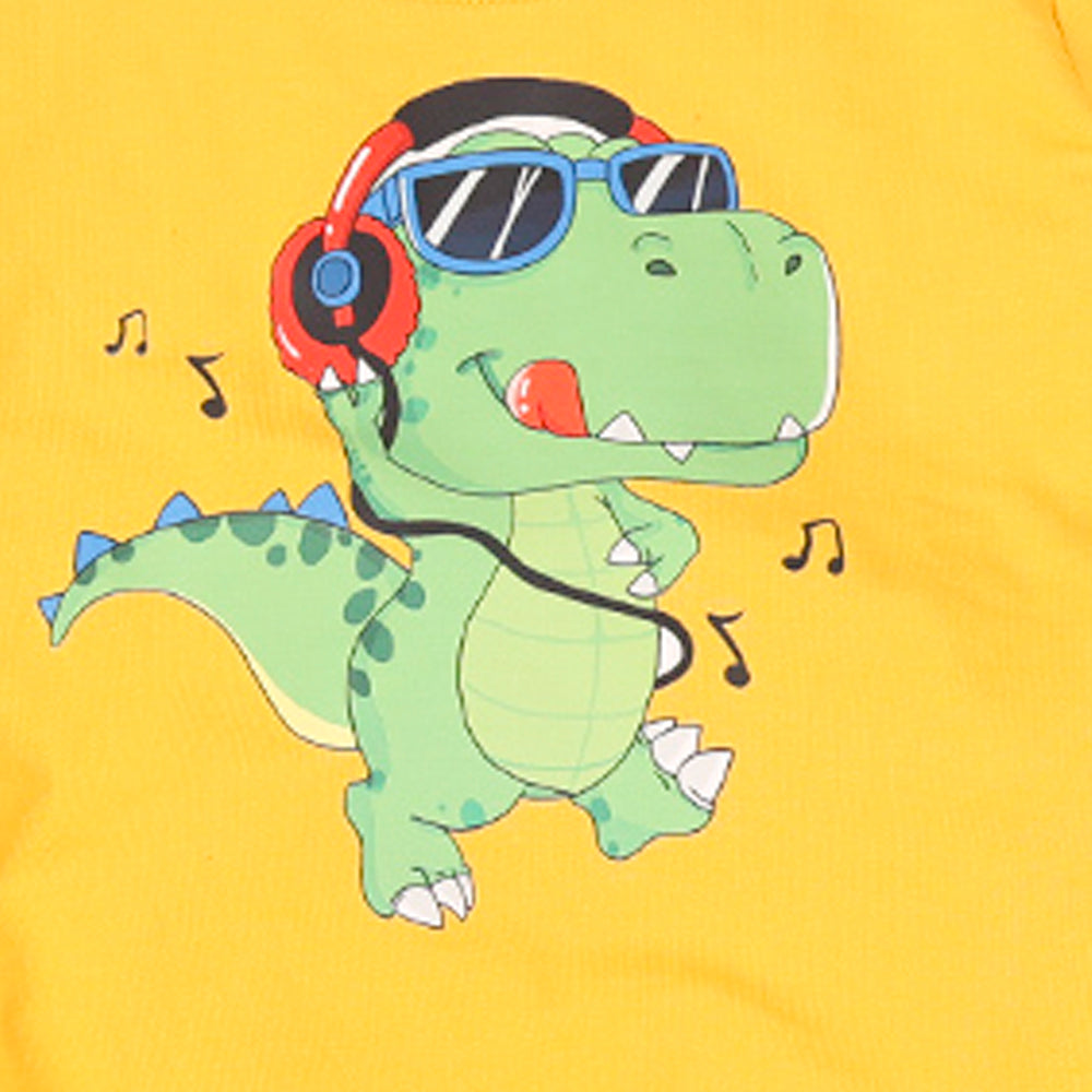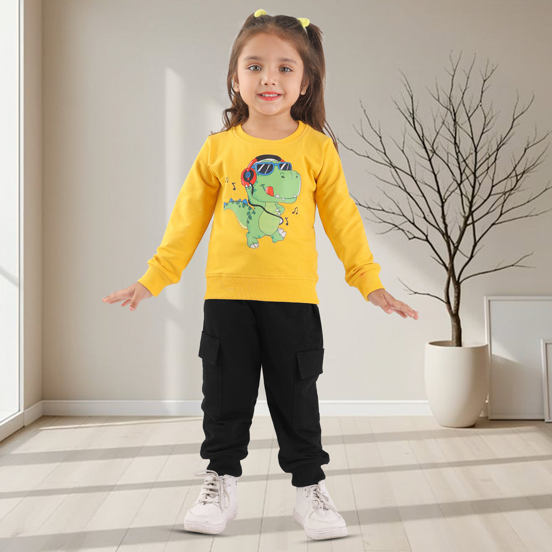 Let your little dino-lover groove in style with this vibrant Yellow and Black Dinosaur-Themed Unisex Coord Set for kids aged 2 to 9 years. Made from super soft and breathable cotton knit fabric, the set includes a full-sleeve sweatshirt featuring a cool dinosaur wearing headphones and shades — ready to jam!