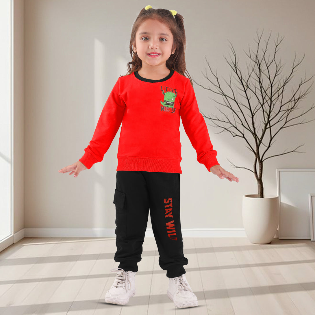 Unleash the wild side of your little one with this bold Red and Black Monster-Themed Unisex Co-ord Set, perfect for kids aged 2 to 9 years. Crafted from soft and breathable cotton knit fabric, the full-sleeve red sweatshirt stands out with its striking “Little Monster” print and playful black neckline, adding just the right touch of fun.