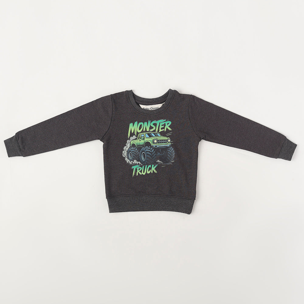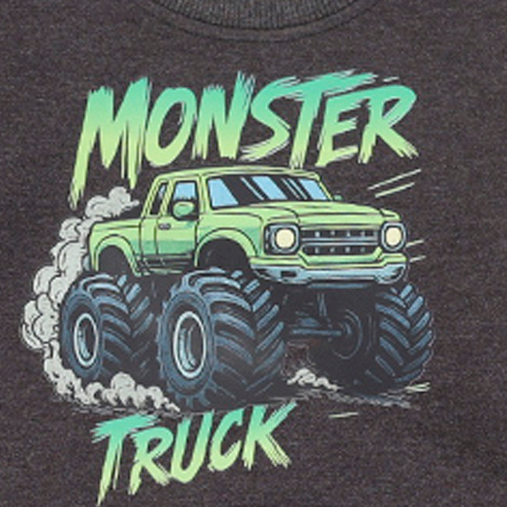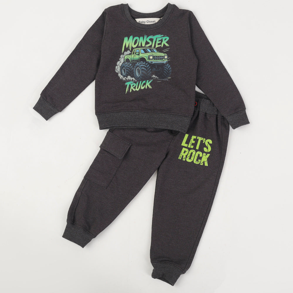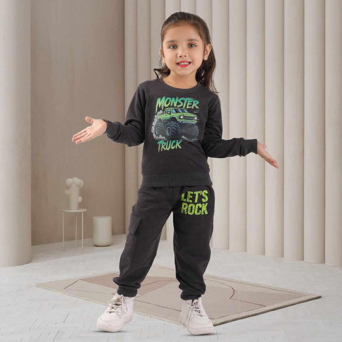 Get your little rockstar ready to roll with this cool Monster Truck-Themed Unisex Coord Set for kids aged 2 to 9 years. Made from soft and durable cotton knit fabric, this charcoal grey set includes a full-sleeve sweatshirt featuring a bold “MONSTER TRUCK” graphic and matching jogger pants printed with “LET’S ROCK”.