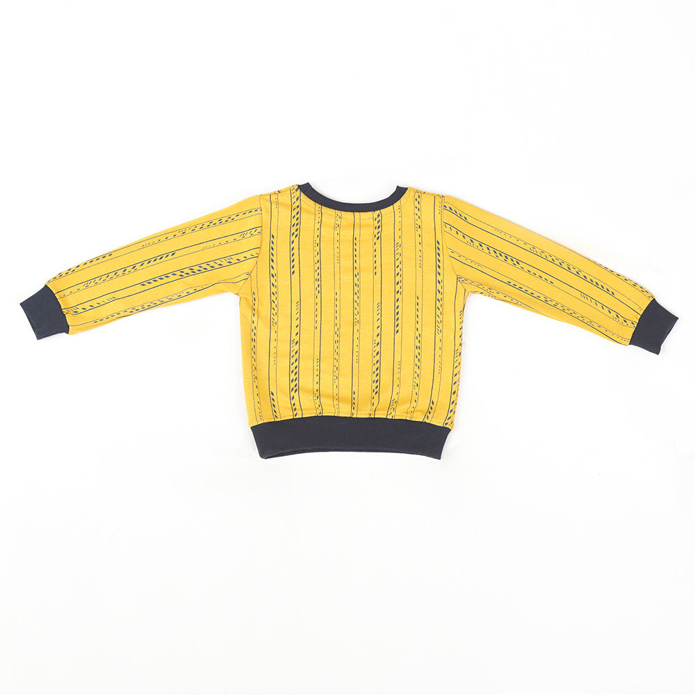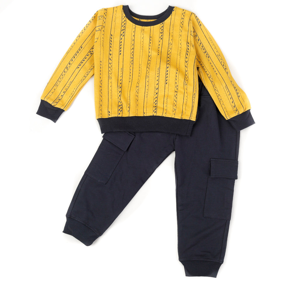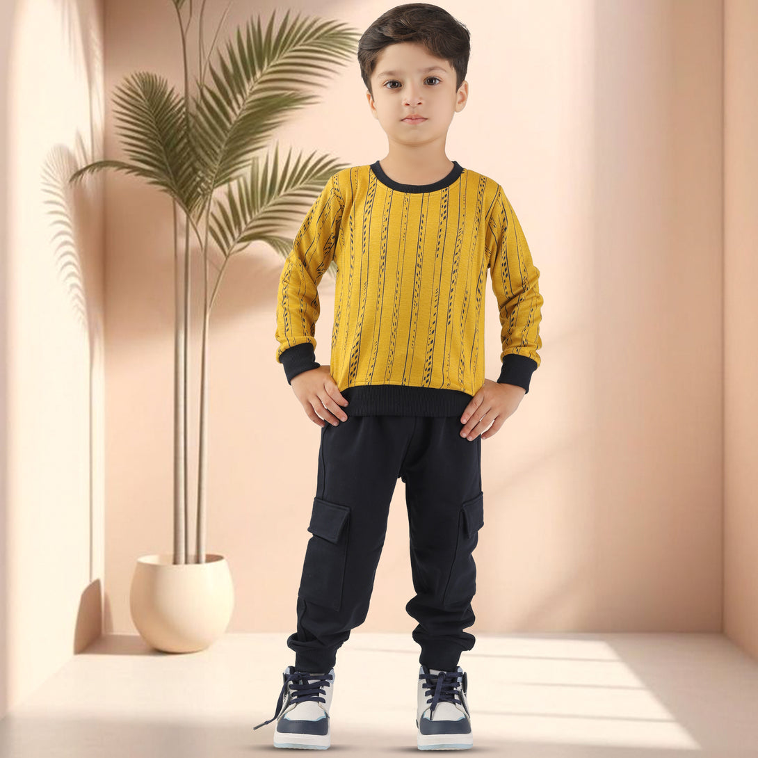 Add a splash of bold style to your child’s everyday look with this Trendy Mustard and Navy Blue Unisex Coord Set for kids aged 2 to 9 years. Made from soft and breathable cotton knit fabric, the set features a full-sleeve sweatshirt with vertical textured print details, paired with comfy cargo-style jogger pants in deep navy.